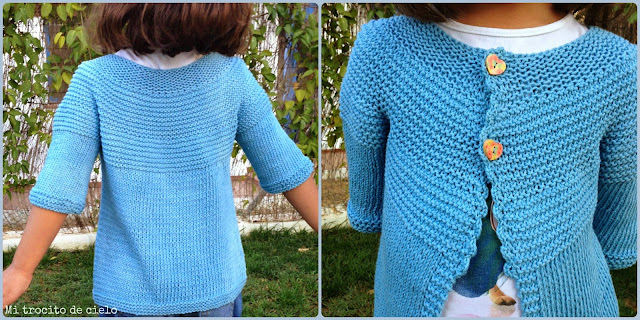 Es una chaqueta realizada en algodón 100% con una textura y calidad maravillosas e ideal para los más pequeños y, sobre todo, perfecta para esta primavera. Está tejida con agujas circulares, las cuales nunca había probado, bueno para ser sincera, ni siquiera las había visto antes de comenzar la rebeca!! Pero la verdad es que me han sorprendido y me han resultado muy cómodas para tejer.
